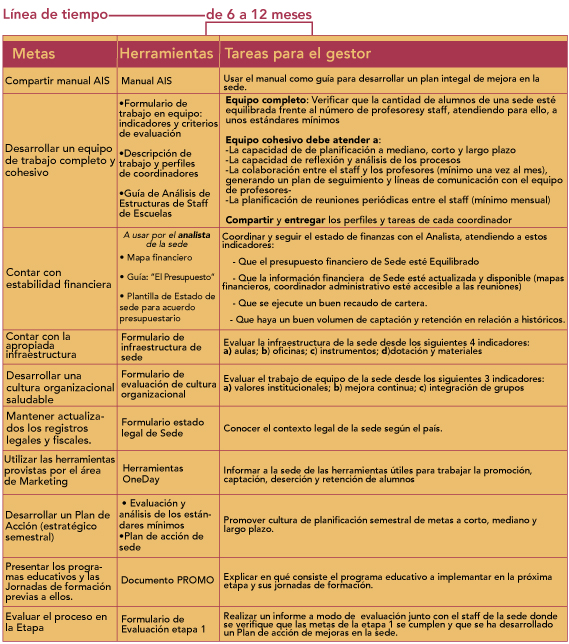 La etapa 1 del AIS propone la revisión de los estándares mínimos de calidad necesarios para el funcionamiento óptimo de la sede, relacionados con diferentes áreas sensibles como recursos humanos, finanzas o marketing, entre otras. La siguiente infografía nos permite identificar las herramientas en relación con las metas que persigue cada etapa y las tareas respectivas para el gestor: